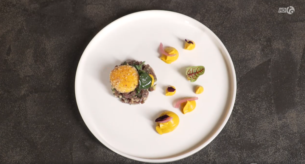 TARTARE DE CHEVREUIL, POMME VERTE, NOISETTES ET PURÉE DE CAROTTES