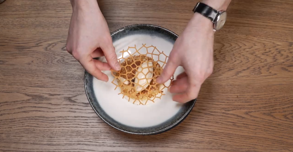 Déclinaison de sarrasin, tuile au miel et glace miso